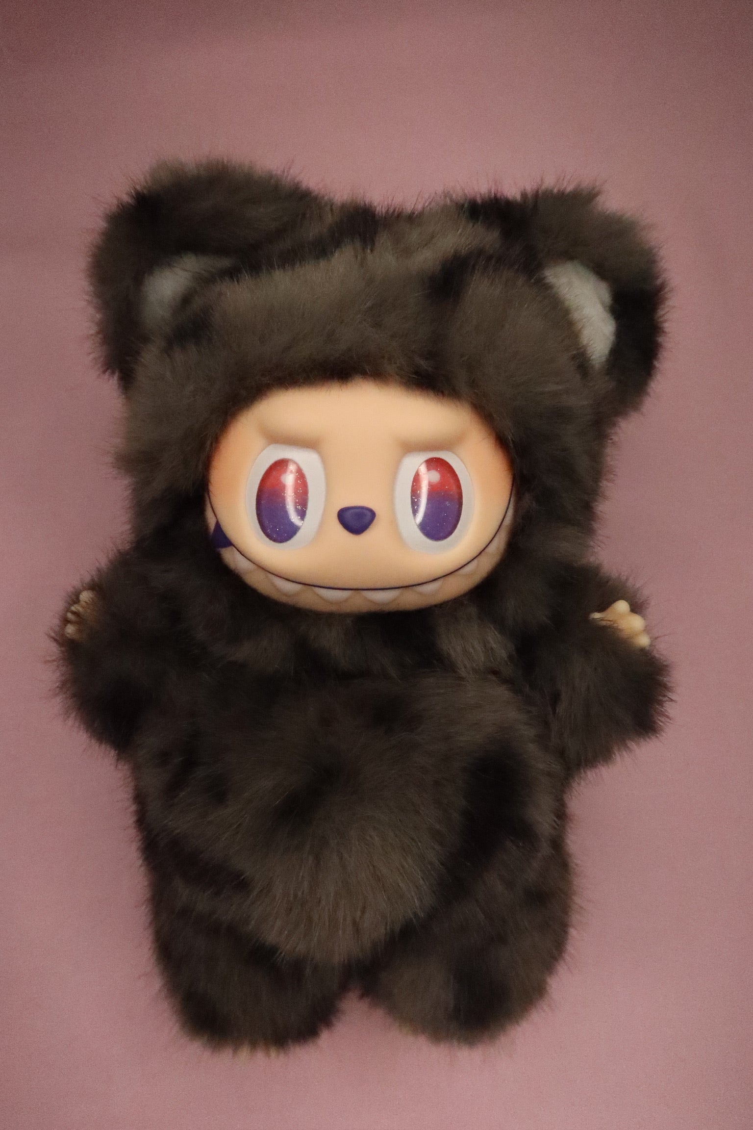 Black and brown striped custom Bubu with pink and purple gradient eyes and a purple nose