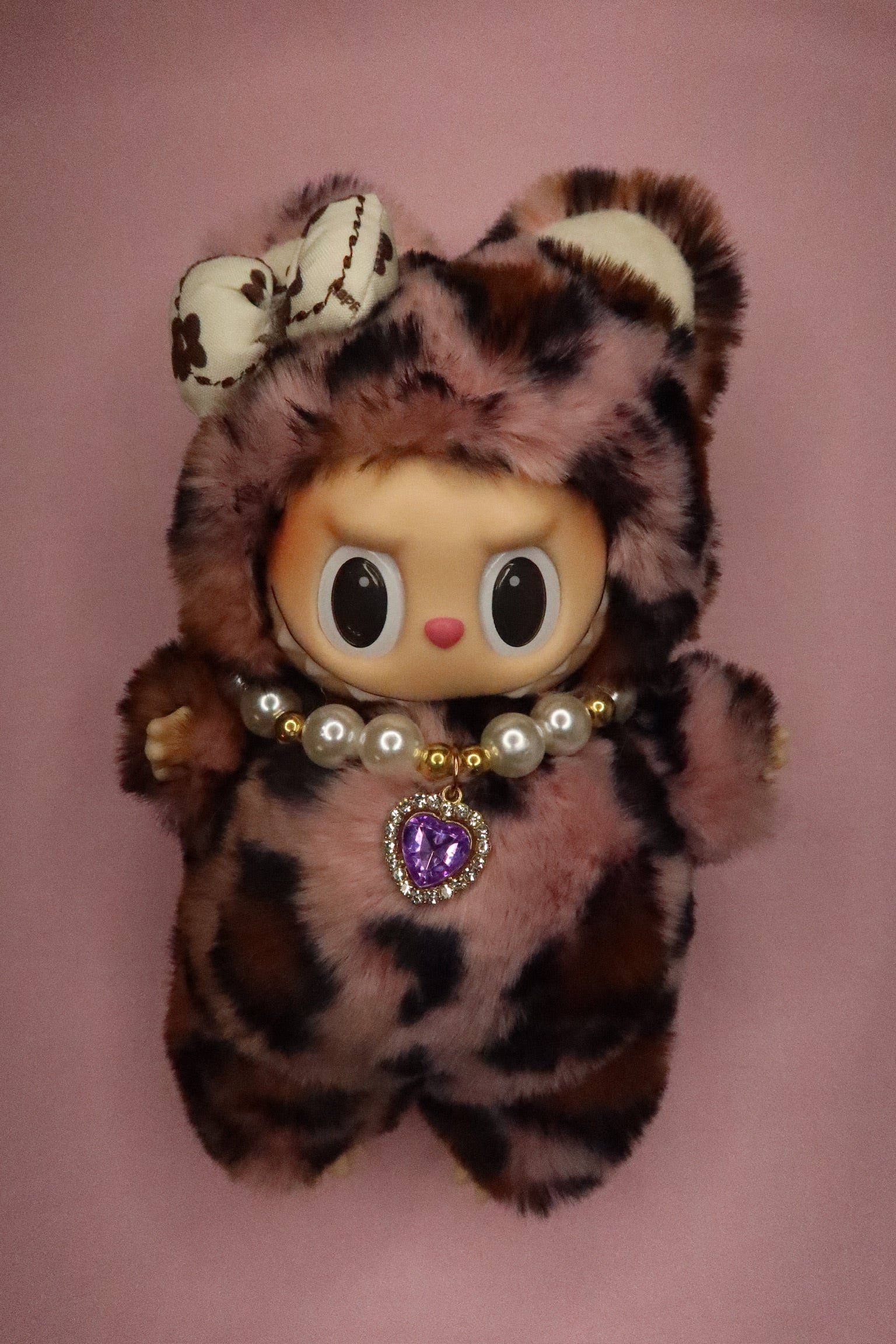 This little pink leopard bubu has fluffy fur, a cute bow, and a matching necklace for added charm