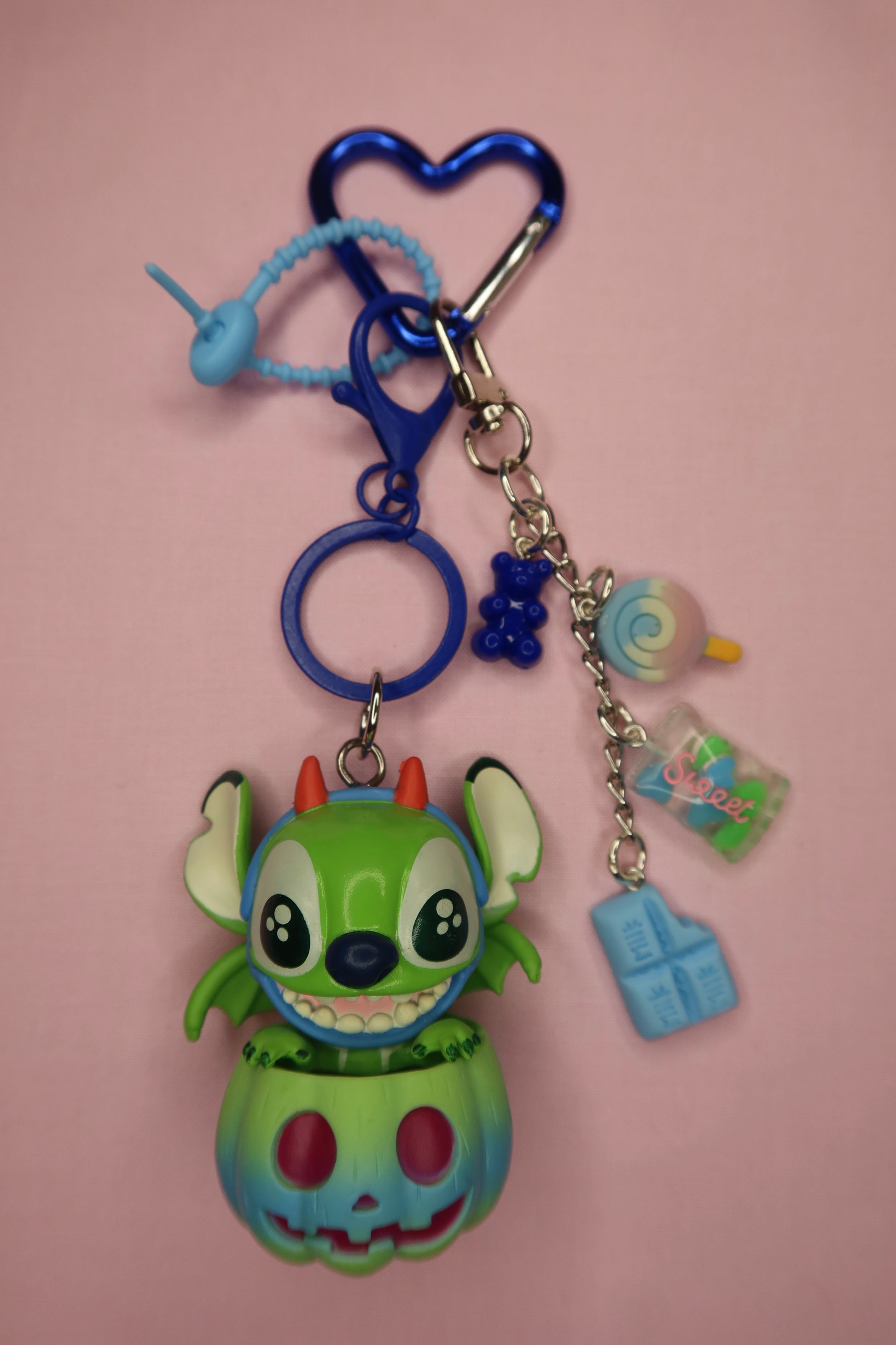 Green stitch in a carved pumpkin, includes a blue gummy bear, lollipop, blue chocolate bar, and sweet treat charms! Comes with a blue heart carabiner and light blue tag