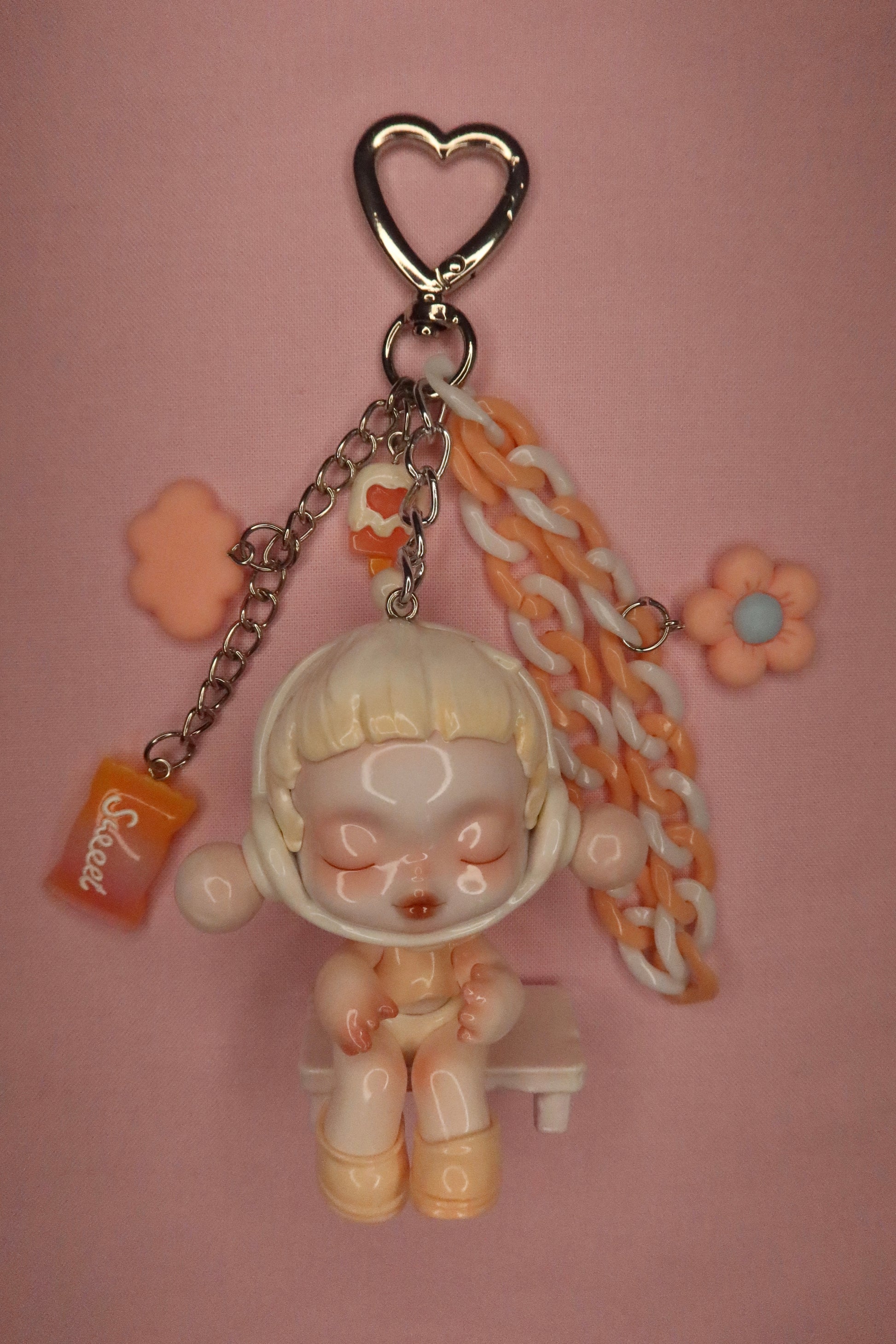 Sitting on her bench, SP is keychained with a cloud, flower, sweet treat, popsicle, and a peach & white chain